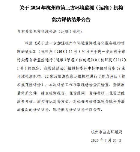 喜报!我公司获评2024年杭州市A级第三方环境监测机构!