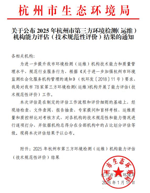 喜报!我司喜获2025年杭州市第三方环境监测(运维)机构能力评估A级评价