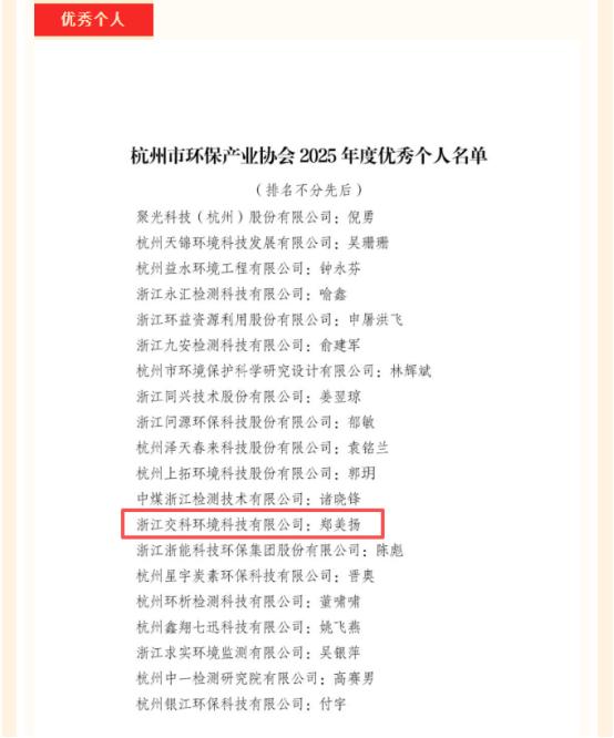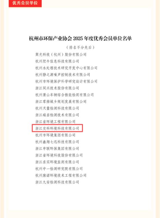 近日,杭州市环保产业协会发布2025年度表彰决定,我公司凭借过去一年的优异表现,再度获评“优秀会员单位”荣誉称号,公司副总经理郑美扬荣获“优秀个人”称号。